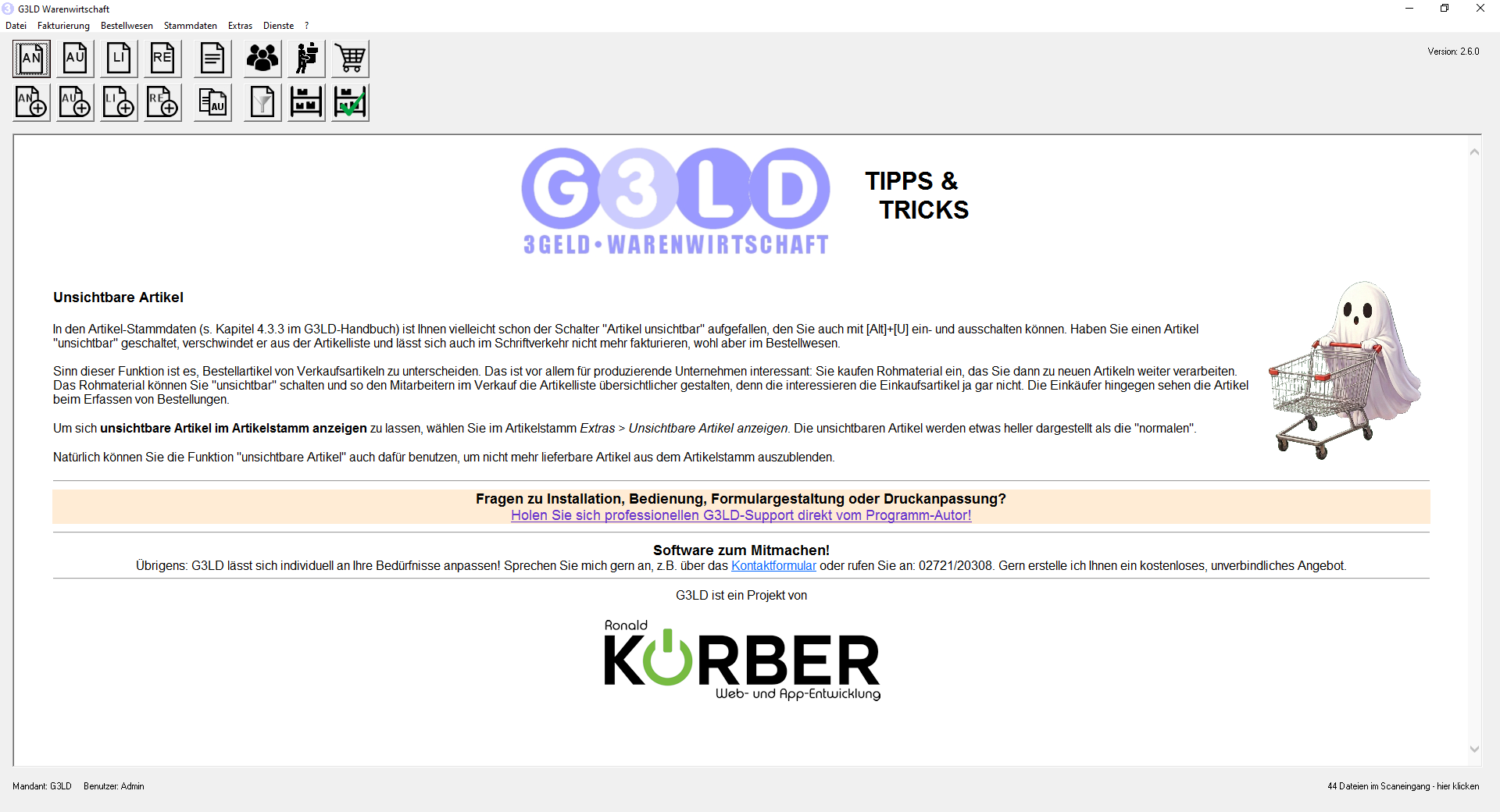G3LD ist die kostenlose, branchenneutrale, uneingeschränkt netzwerkfähige Freeware-Warenwirtschaft für kleine und mittlere Unternehmen inklusive Bestellwesen, Offene-Posten-Verwaltung und Reklamationsabwicklung. G3LD ist darüber hinaus mandantenfähig und kann auch in der Cloud installiert werden, sodass Sie oder Ihre Außendienstler und Filialen von überall auf der Welt Zugriff haben. Und: G3LD ist nahezu beliebig anpassbar. Wenn Sie etwas mehr brauchen, als G3LD liefert, programmieren wir es gern für Sie dazu. Sprechen Sie uns bei Bedarf einfach an.